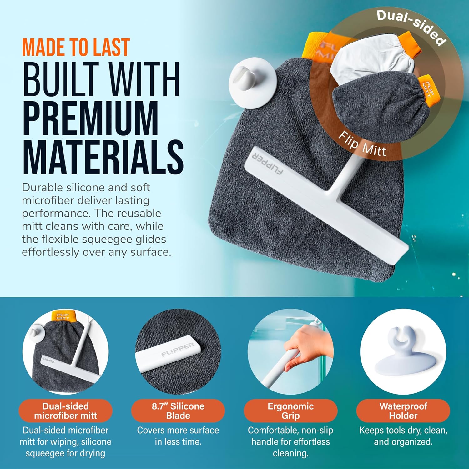 - The ergonomic squeegee features an 8.7" wide silicone blade for streak-free drying on glass, acrylic, and more.